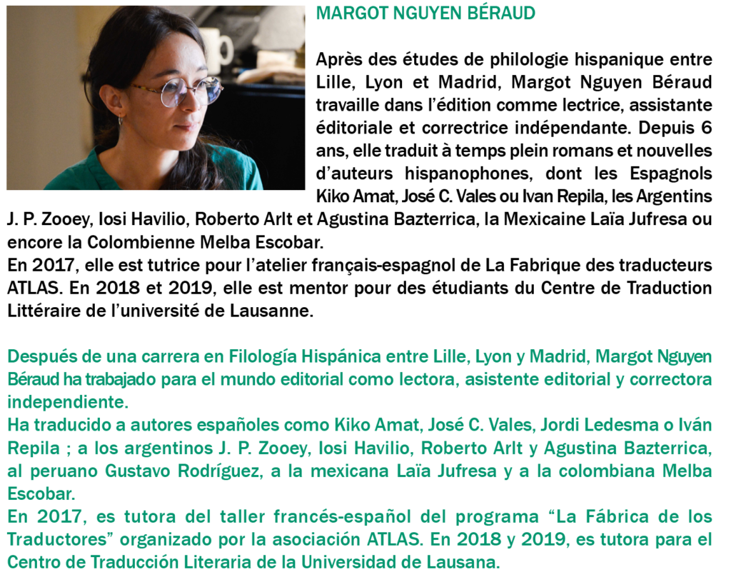 L’atelier espagnol-français 2020 se déroulera du lundi 23 au samedi 28 novembre, à la mythique Residencia de estudiantes de Madrid. Il prévoit la participation de 9 traducteur·rice·s – 4 traduisant vers l’espagnol et 5 vers le français –, et de 2 traductrices coordinatrices : Margot Nguyen Béraud et Malika Embarek López.