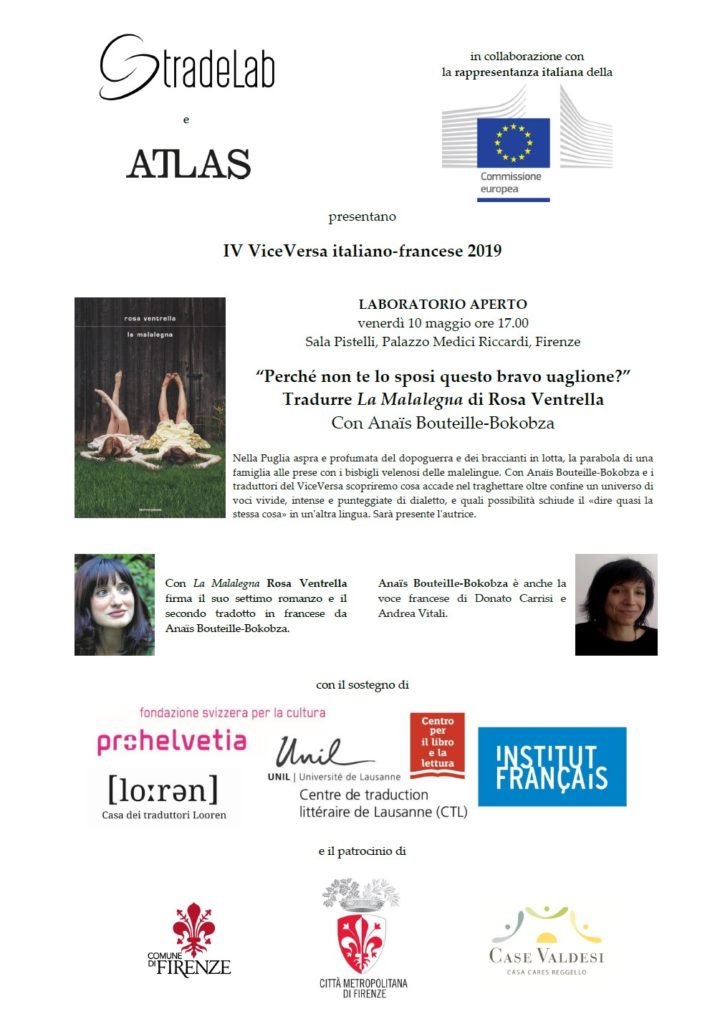 Du mardi 7 au mardi 14 mai 2019, StradeLab et ATLAS organisent un atelier italien-français en résidence à la Casa Cares, Reggello (Florence, Italie). Il prévoit la participation de 12 traducteurs, 6 traduisant vers l’italien et 6 traduisant vers le français dont deux traductrices coordinatrices : Luciana Cisbani et Dominique Vittoz