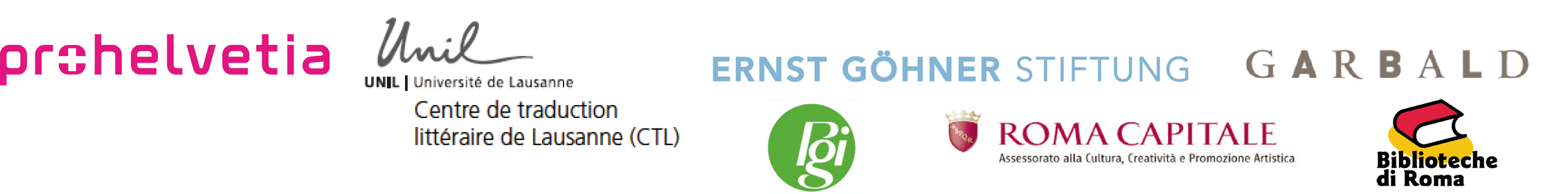 Avec le soutien de la Fondation suisse pour la culture Pro Helvetia, du Centre de traduction littéraire de Lausanne, de la Ernst Göhner Stiftung, de la Fondazione Garbald, de Pro Grigioni Italiano, en collaboration avec la Casa delle Traduzioni di Roma