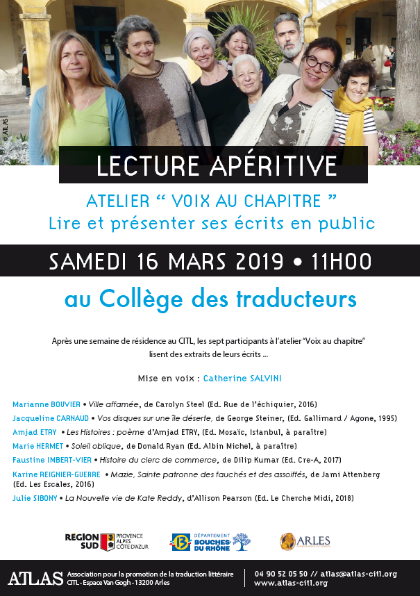 L’atelier ATLAS “Voix au chapitre” 2019 s’est déroulé du 11 au 16 mars au CITL d’Arles, animé par Catherine Salvini, comédienne et metteur en scène.