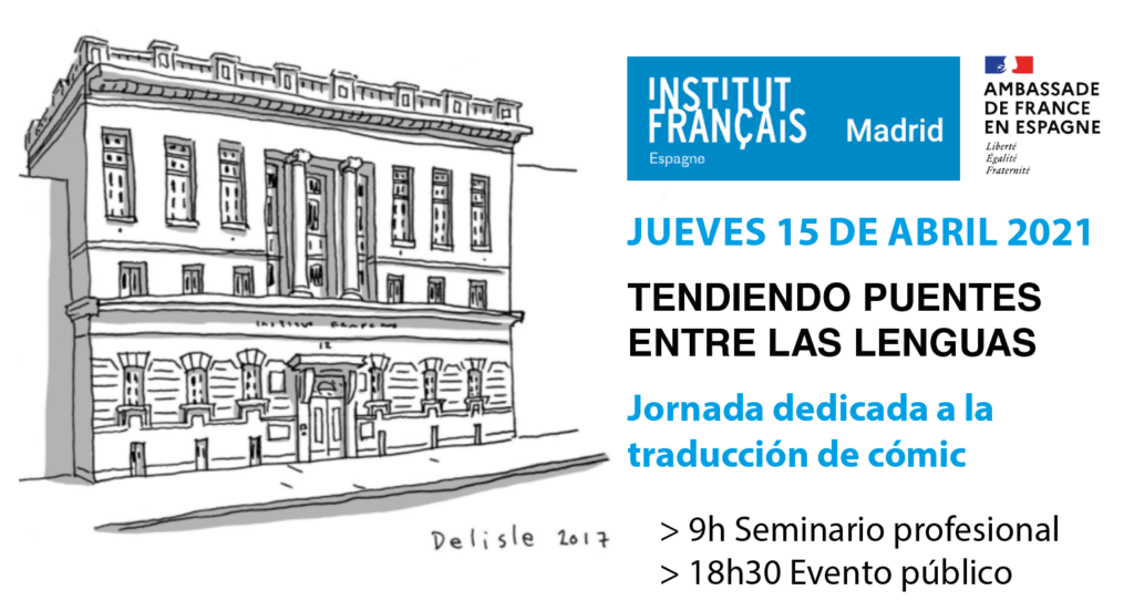 Dans le cadre de l’Année de la bande dessinée 2020-21, l’Institut français d’Espagne de Madrid organise une journée professionnelle dédiée à la traduction de bande dessinée, le jeudi 15 avril 2021. Celle-ci débutera à 9h au théâtre et à la médiathèque de l’Institut par un séminaire professionnel réservé aux professionnels et aux jeunes traducteurs, et finira par deux événements publics, à 18h30 à la médiathèque et à 20h au théâtre.