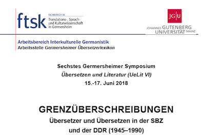La Faculté de traductologie, linguistique et études culturelles de Germersheim, rattachée à l’université Johannes Gutenberg de Mayence (Rhénanie-Palatinat), propose du 15 au 17 juin 2018 son sixième colloque « Traduction et littérature » sur le thème « Traducteurs et traduction dans l’ex-RDA et l’ex-zone d’occupation soviétique, de 1945 à 1990 ». L’appel à communication et les inscriptions sont ouvertes jusqu’au 28 février.