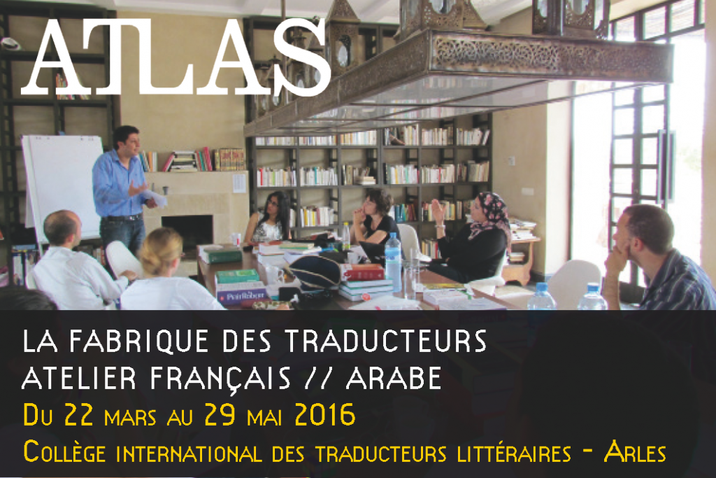 Du 22 mars au 29 mai 2016, le Collège international des traducteurs littéraires à Arles accueillera un nouvel atelier français/arabe dans le cadre du programme de formation mis en œuvre par ATLAS, la Fabrique des traducteurs. L’appel à candidatures est ouvert et la date limite est fixée au 15 janvier 2016.