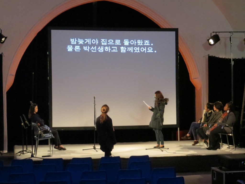 Depuis le 1er septembre, le tout premier atelier français/coréen de la Fabrique des traducteurs est en résidence au CITL. Lundi, le travail de mise en voix des textes que les six jeunes traductrices ont choisis pour ce programme a débuté. Dernière étape de l’atelier, elles ont cinq jours pour préparer leurs « Encres fraîches », deux lectures publiques qui auront lieu samedi 7 novembre 2015, à 17h15 au Capitole, à l’occasion des 32es Assises de la traduction littéraire à Arles, et mardi 10 novembre à 18h30 au Centre culturel Coréen à Paris. Voici en quelques mots comment Catherine Salvini, la metteur en scène, a abordé cette préparation.