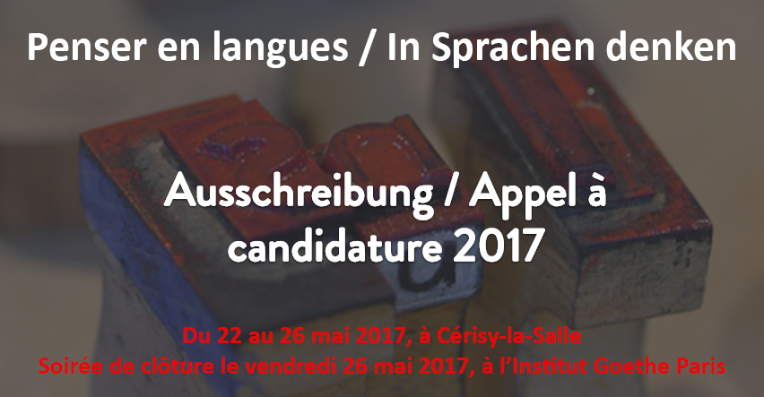La 3e édition de « Penser en langues – In Sprachen denken », rencontre franco-allemande de traducteurs en sciences humaines et sciences sociales – se tiendra à Cérisy-la-Salle du 22 au 26 mai 2017. L’appel à participation est ouvert jusqu’au 27 janvier 2017.