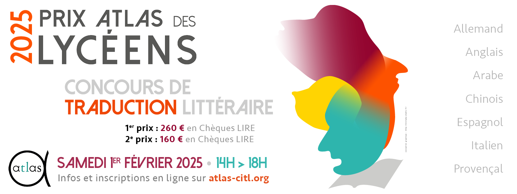 Ce concours, organisé par ATLAS, récompense chaque année des lycéen·nes de la Région Sud Provence-Alpes-Côte d’Azur pour la meilleure traduction littéraire d’un texte original en allemand, anglais, arabe, chinois, espagnol, italien et provençal.