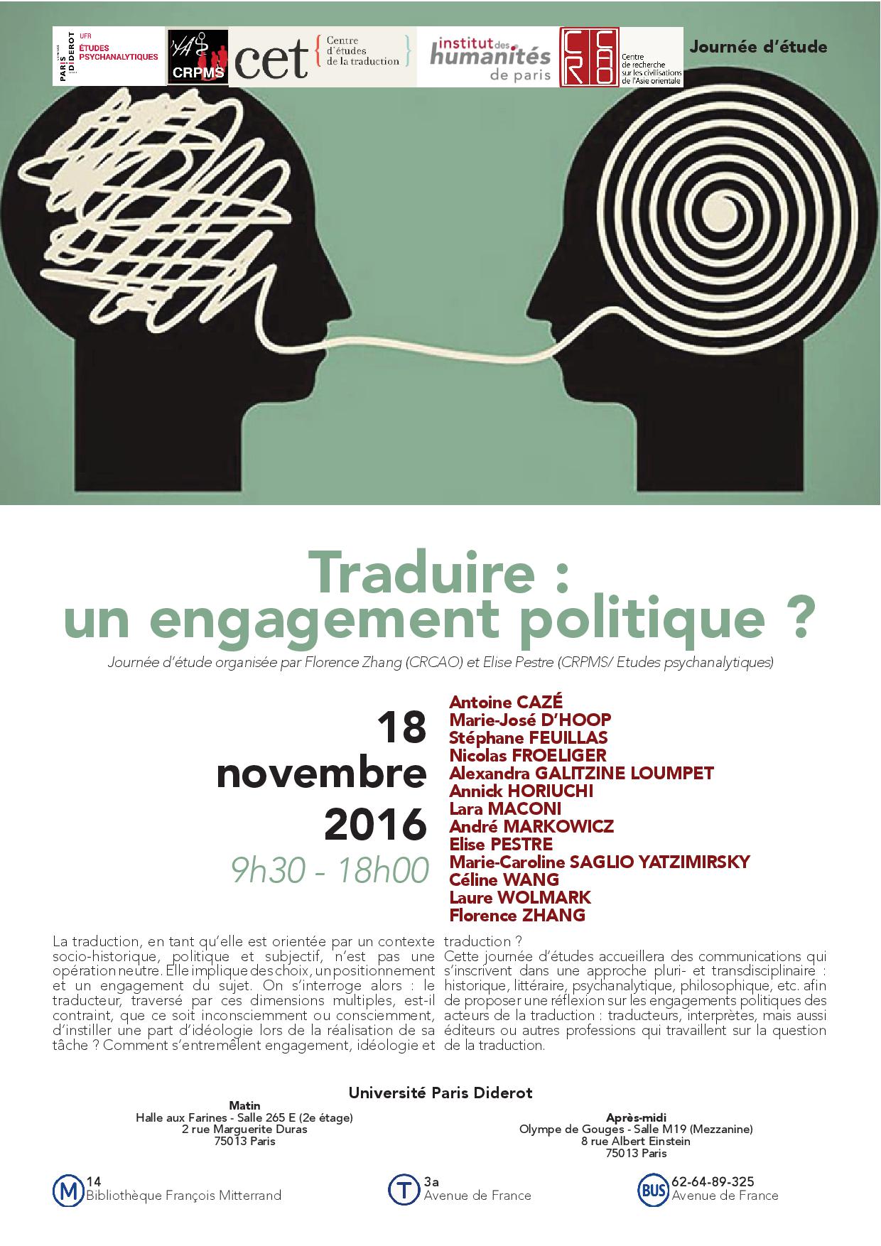 Le CET (Centre d’études de la traduction) programme une journée d’étude, intitulée « Traduire : un engagement politique ? », organisée par Florence Zhang (CRCAO) et Elise Pestre (CRPMS/ Etudes psychanalytiques) à l’université Paris Diderot – Paris 7, vendredi 18 novembre 2016, à partir de 9h30.