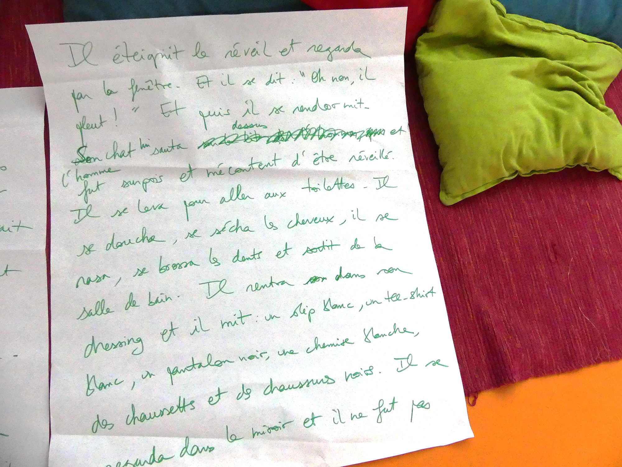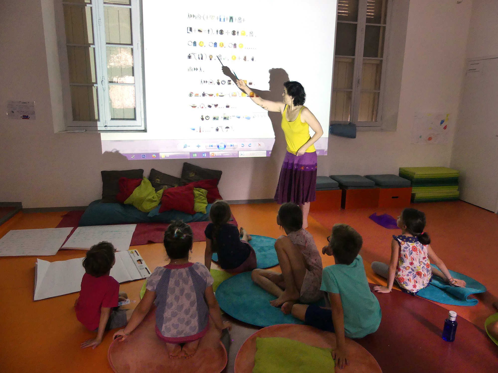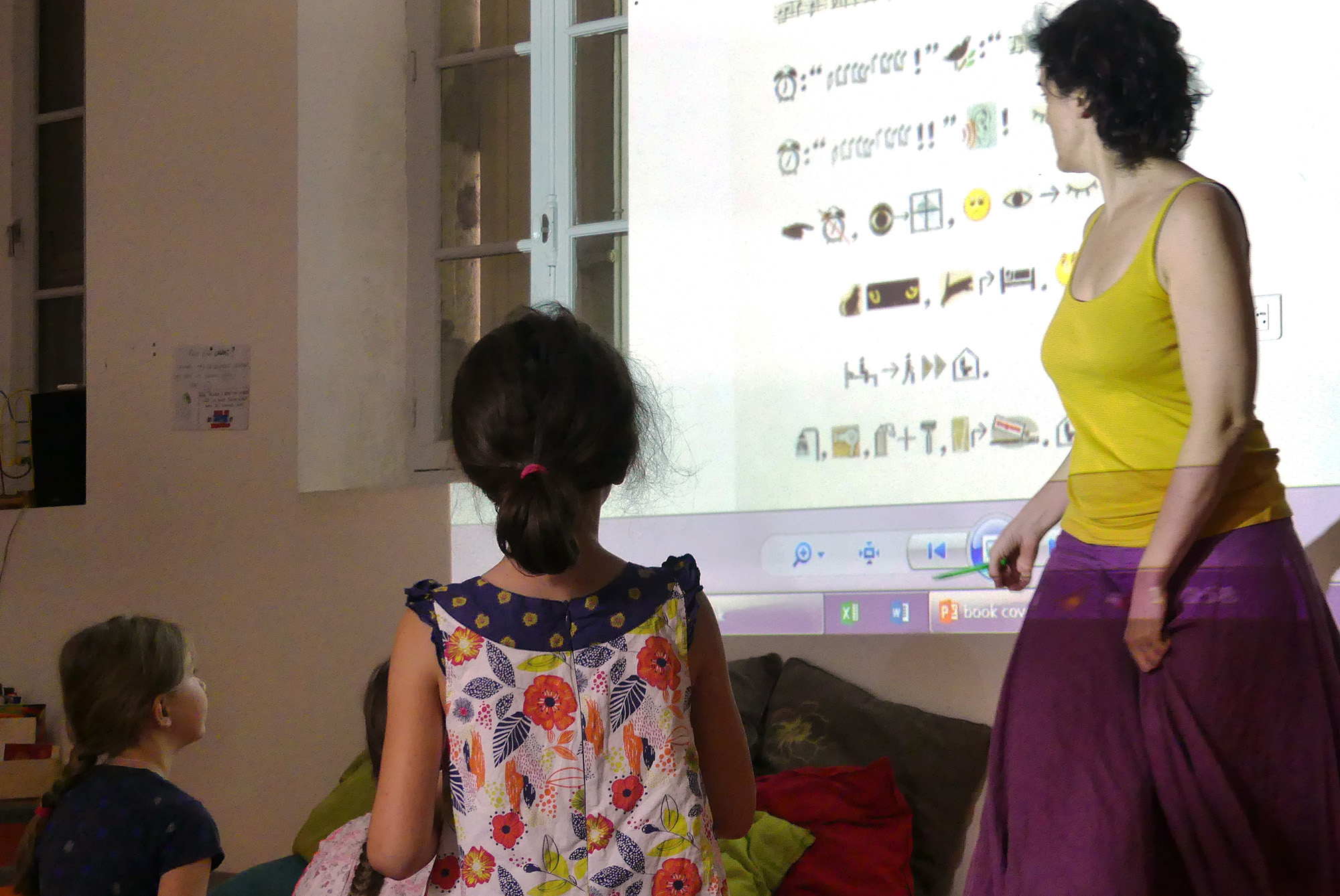 Après cette courte introduction, nous nous sommes proposé de traduire en français le premier chapitre d’Une histoire sans mots de l’artiste chinois Xu Bing, livre composé exclusivement de pictogrammes et émoticônes. Sur proposition des enfants, nous avons baptisé cette langue étrange le « smiley », devenant ainsi les premiers traducteurs smiley/français. Nous avons procédé à un déchiffrage collectif page par page, chacune des quatre pages à traduire étant projetée sur le mur de la salle. Une fois que les enfants s’étaient mis d’accord sur l’interprétation des symboles, il s’agissait de mettre le récit en mots sous la forme d’une histoire classique commençant par le traditionnel « Il était une fois », en s’efforçant de bâtir une narration fluide et cohérente.