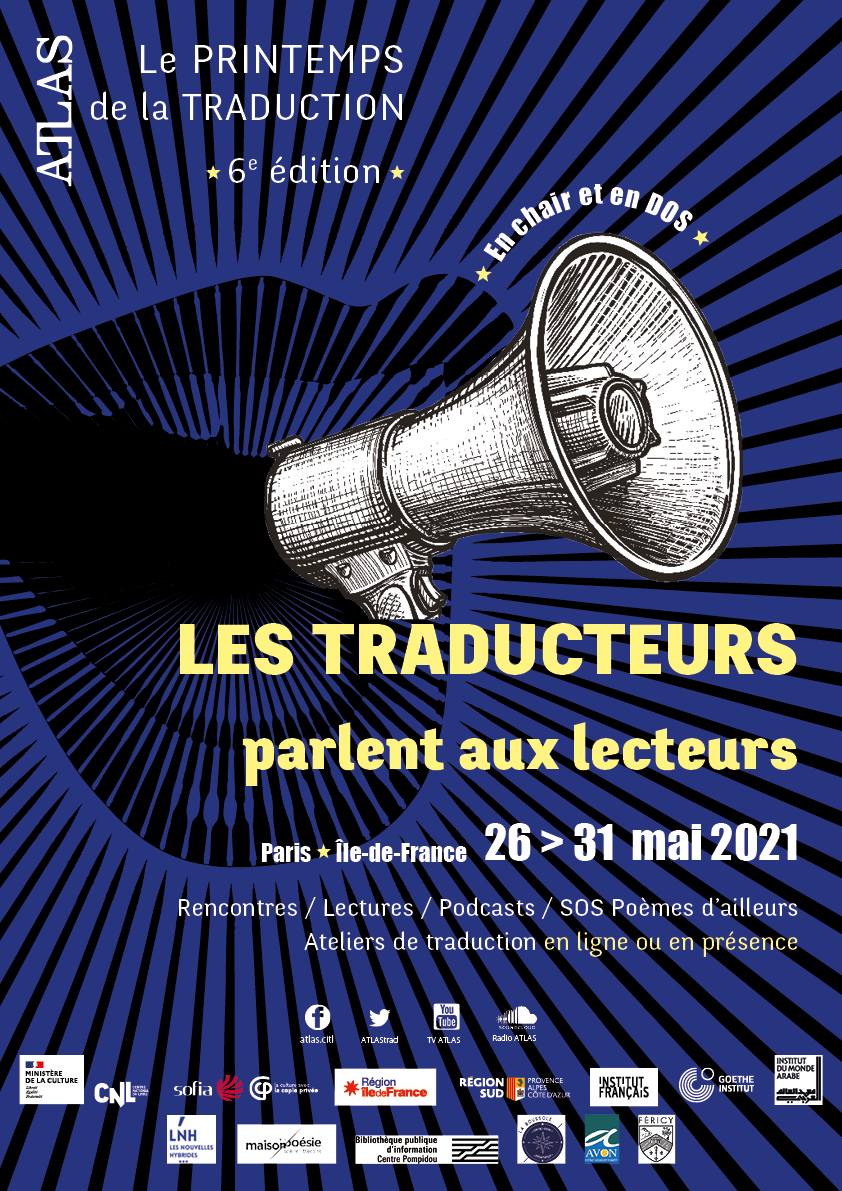 « Le joli mai arrive, il paraît que c’est la saison des pivoines et des traducteurs. Pour son 6e PdT (plus connu sous le nom de Printemps de la traduction), ATLAS ressort le mégaphone : cette année, sans faute, les traducteurs parleront aux lecteurs. Cette édition hybride a été pensée comme un pont ; un fil tendu entre les images de l’édition 2020 de notre festival arlésien, les Assises de la traduction : Au commencement était l’image, et l’écologie de celles de 2021 : Et pourtant elle tourne. Et comme chaque année depuis maintenant 6 ans, chers festivaliers et chères festivalières d’Île-de-France et de Navarre, nous avons tâché d’être aussi éclectiques qu’exigeants pour parler de traduction et surtout la faire résonner en vous. »