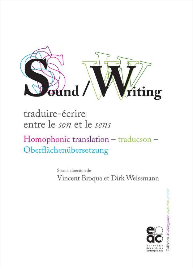 Qu’est-ce que la traduction homophonique ? Aussi connue sous le nom de « traducson » ou de « traduction de surface » (de l’allemand Oberflächenübersetzung), elle avait fait l’objet d’un colloque international organisé par Vincent Broqua de l’université Paris 8, en novembre 2016. Aujourd’hui, sous sa direction et celle de Dirk Weissmann, paraît un ouvrage rassemblant les contributions et communications de cet événement, aux Éditions des Archives Contemporaines : Sound /Writing : traduire-écrire entre le son et le sens. Accessible intégralement en Open Access sur le site de l’éditeur, vous pourrez trouver des articles signés notamment de Charles Bernstein, Jean-Jacques Lecercle, Isabelle Alfandary, Abigail Lang, Ryan Fraser, Chris Clarke, Lily Robert-Foley, Camille Bloomfield, Santiago Artozqui, Jacques Lajarrige, Claus Telge, Ulrike Draesner, Uljana Wolf, Yoko Tawada, Alain Chevrier, Till Dembeck, Bénédicte Vilgrain ou Cole Swensen.