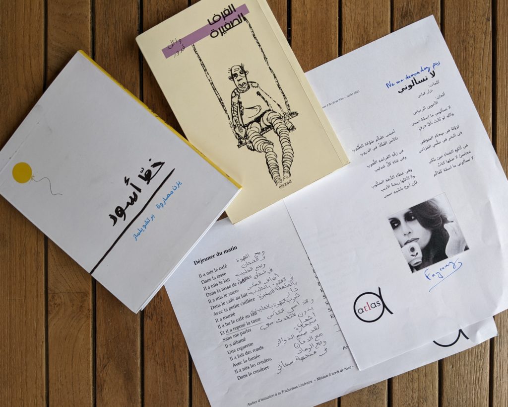 Cet atelier d’initiation à la traduction littéraire à la Maison d’arrêt de Nice à destination d’un public arabophone compte certainement parmi mes plus belles expériences professionnelles et personnelles. Lors de cinq séances matinales de 2h chacune, une petite dizaine de participants a traduit tour à tour Fayrouz, Nizar Qabbani, Jacques Prévert, Mahmoud Darwich, Waël Kaddour, Yazan Al-Masarwah , soit un florilège de genres littéraires : poésie, chanson, théâtre, littérature enfantine ! Riches de leurs origines et compétences linguistiques, les participants ont fait preuve d’une détermination sans faille, qui je dois dire m’a beaucoup impressionné. On retiendra notamment qu’ils ont réalisé la première traduction en français du livre graphique pour jeunes enfants intitulé « Khat aswad » (Ligne noire), publié en Jordanie en 2022.
