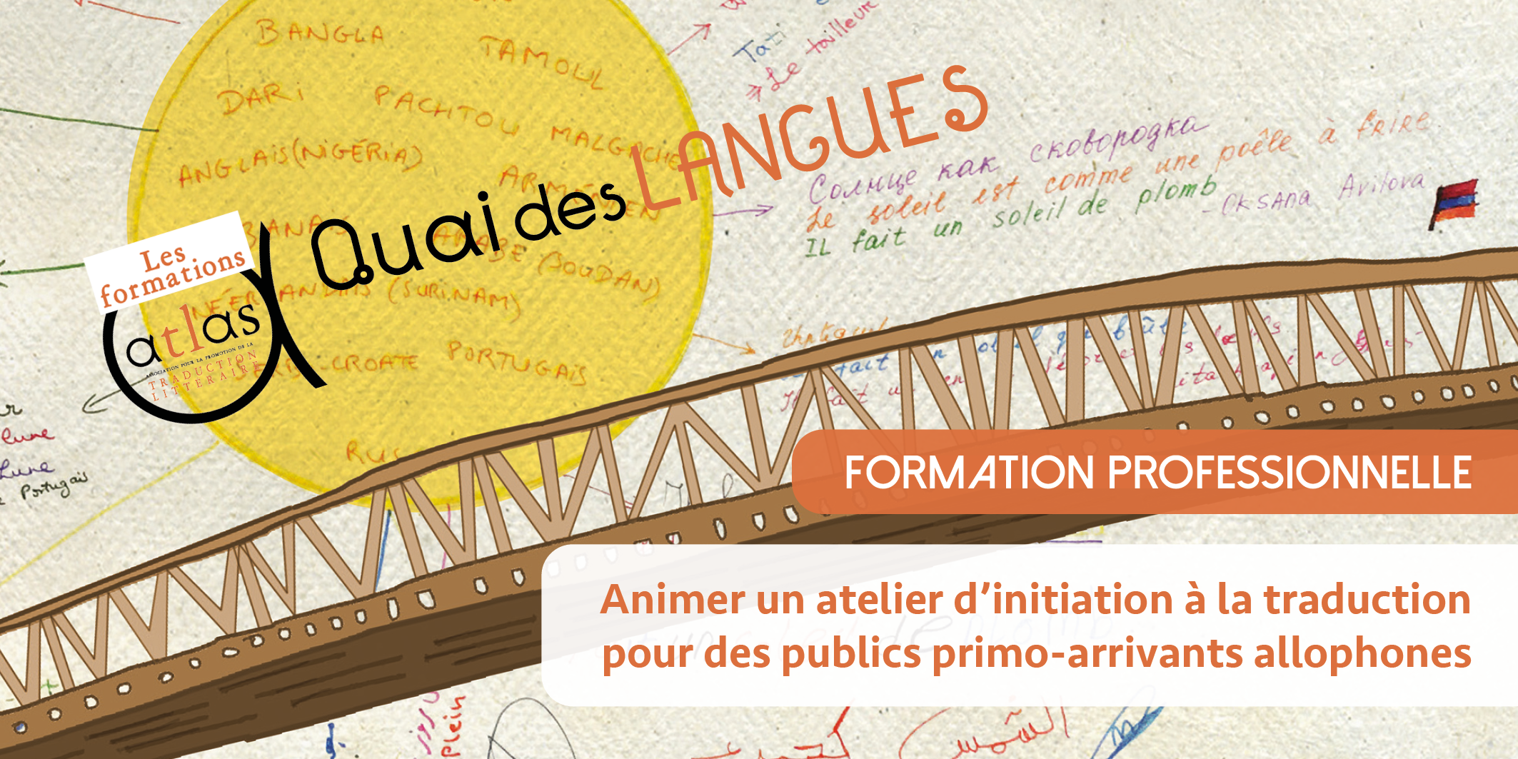 Quai des langues propose la traduction littéraire comme un formidable outil de réflexion, d’émancipation et de dialogue, en affirmant que la pluralité des langues et des cultures, loin d’être un obstacle à l’intégration, est une richesse. Imaginé par l’association ATLAS et soutenu par le ministère de l’Intérieur, ce projet est un programme expérimental dédié au parcours d’intégration des personnes primo-arrivantes allophones. Il repose à la fois sur des formations de traducteurs littéraires professionnels à l’animation d’ateliers fondés sur le partage d’expérience et sur la réalisation d’ateliers de traduction littéraire au sein d’établissements scolaires, de centres de formation linguistique et de structures associatives. Les traducteurs et traductrices littéraires deviennent ainsi acteurs du parcours d’intégration des primo-arrivants.