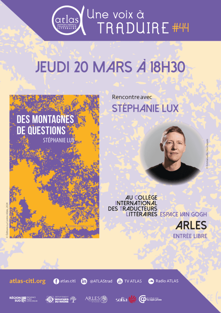 ATLAS invite Stéphanie Lux à présenter Des montagnes de questions (La Contre Allée, 2024), en compagnie des participant·es au programme Goldschmidt actuellement en résidence au CITL. Stéphanie Lux a participé au Programme en 2004, puis l’a tutoré en 2020 ; elle évoque d’ailleurs cette expérience dans « Des Montagnes de questions »