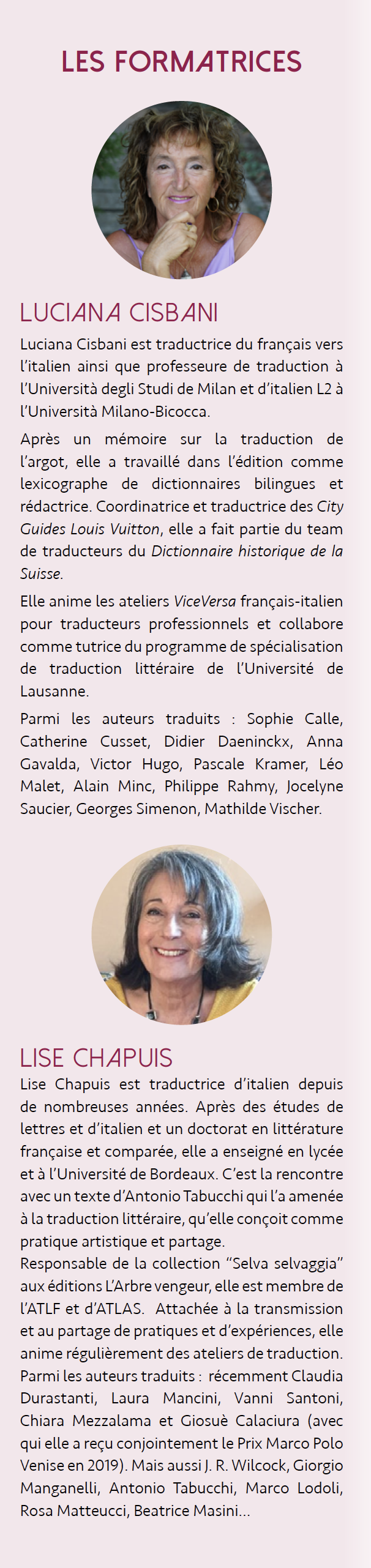 Du mardi 9 au mardi 16 avril 2024, le Collège international des traducteurs littéraire accueille un atelier ViceVersa italien ⇄ français composé de 10 traducteur.ices – 5 traduisant vers le français et 5 vers l’italien –, et de 2 traductrices-coordinatrices : Luciana Cisbani et Lise Chapuis.